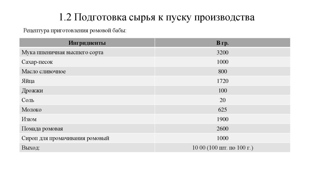 1.2 Подготовка сырья к пуску производстваРецептура приготовления ромовой бабы:
