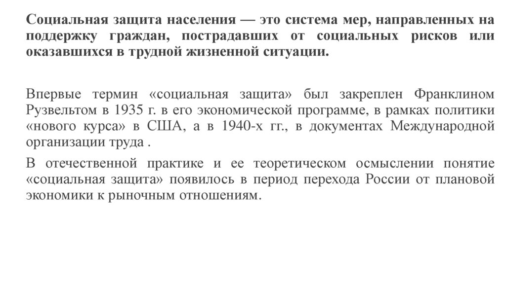 Социальная защита населения — это система мер, направленных наподдержку граждан, пострадавших от социальных рисков или