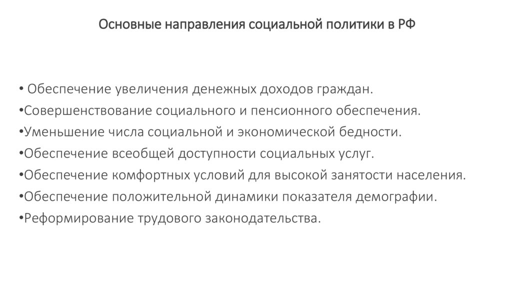 Основные направления социальной политики в РФ• Обеспечение увеличения денежных доходов граждан.