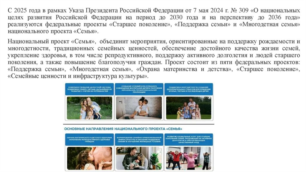 реализуются федеральные проекты «Старшее поколение», «Поддержка семьи» и «Многодетная семья»