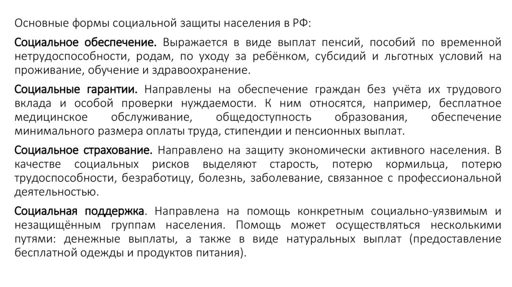 Основные формы социальной защиты населения в РФ:Социальное обеспечение. Выражается в виде выплат пенсий, пособий по временной