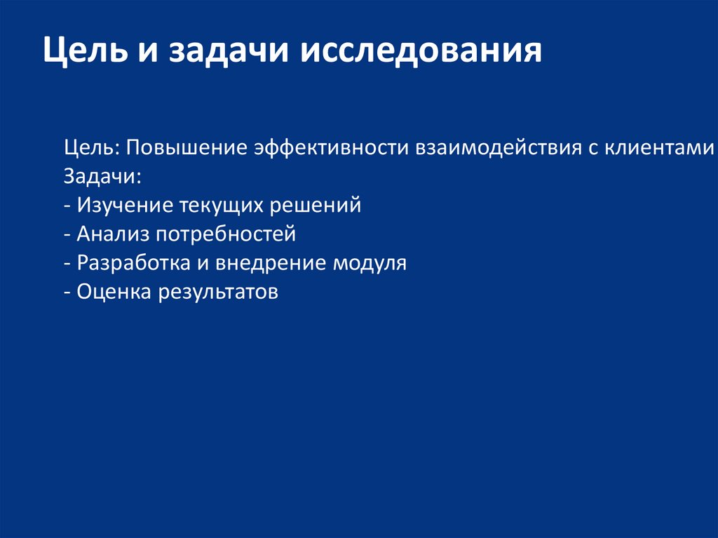 Цель и задачи исследованияЦель: Повышение эффективности взаимодействия с клиентами