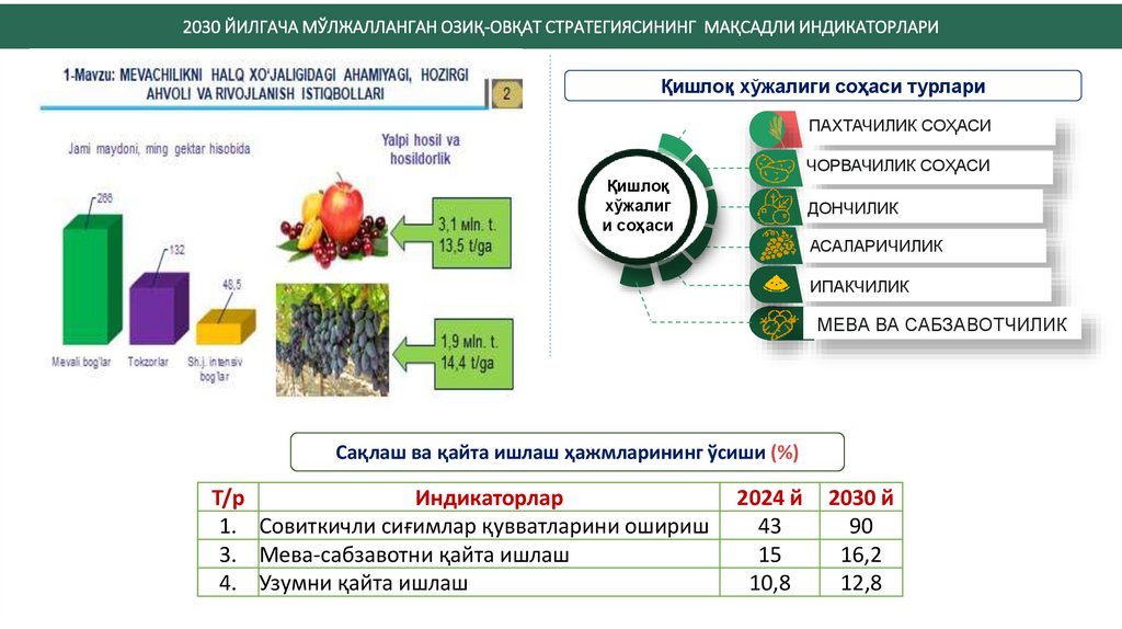 2030 ЙИЛГАЧА МЎЛЖАЛЛАНГАН ОЗИҚ-ОВҚАТ СТРАТЕГИЯСИНИНГ МАҚСАДЛИ ИНДИКАТОРЛАРИҚишлоқ хўжалиги соҳаси турлари