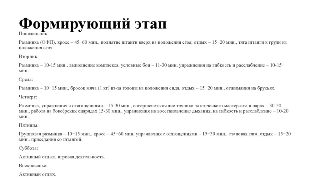 Разминка (ОФП), кросс – 45−60 мин., поднятие штанги вверх из положения стоя, отдых – 15−20 мин., тяга штанги к груди из