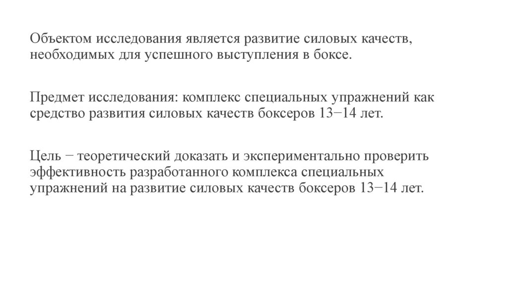 Объектом исследования является развитие силовых качеств,необходимых для успешного выступления в боксе.