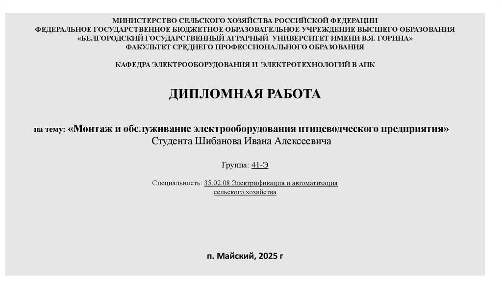 на тему: «Монтаж и обслуживание электрооборудования птицеводческого предприятия»