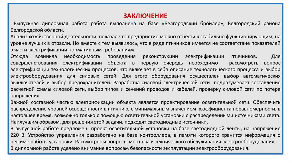 ЗАКЛЮЧЕНИЕВыпускная дипломная работа работа выполнена на базе «Белгородский бройлер», Белгородский района