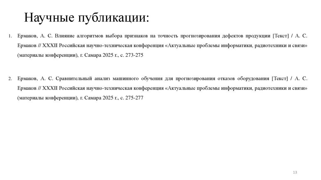 Ермаков, А. С. Сравнительный анализ машинного обучения для прогнозирования отказов оборудования [Текст] / А. C.