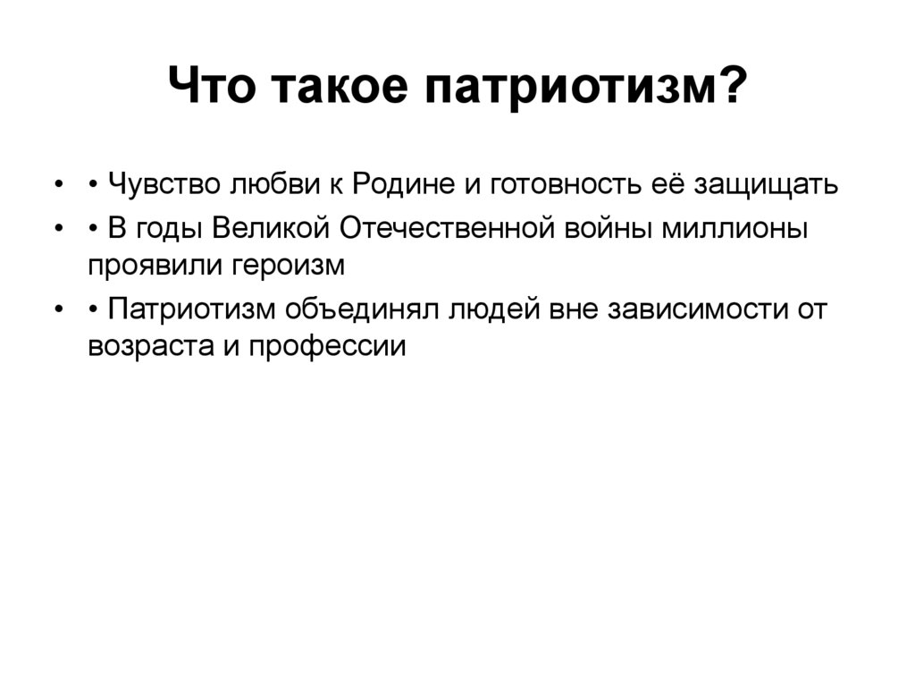 Что такое патриотизм?• • Чувство любви к Родине и готовность её защищать