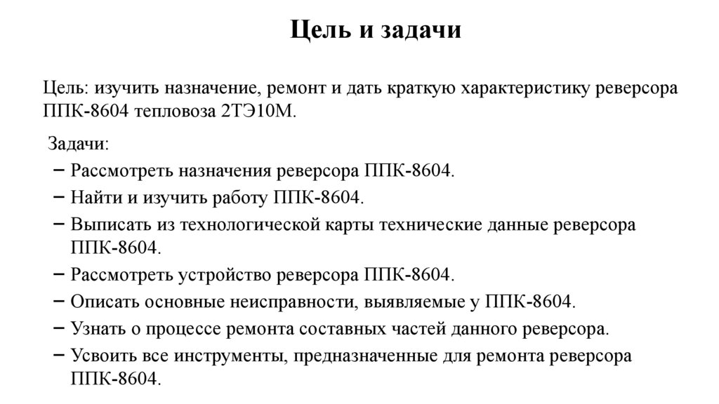 Цель и задачиЦель: изучить назначение, ремонт и дать краткую характеристику реверсора