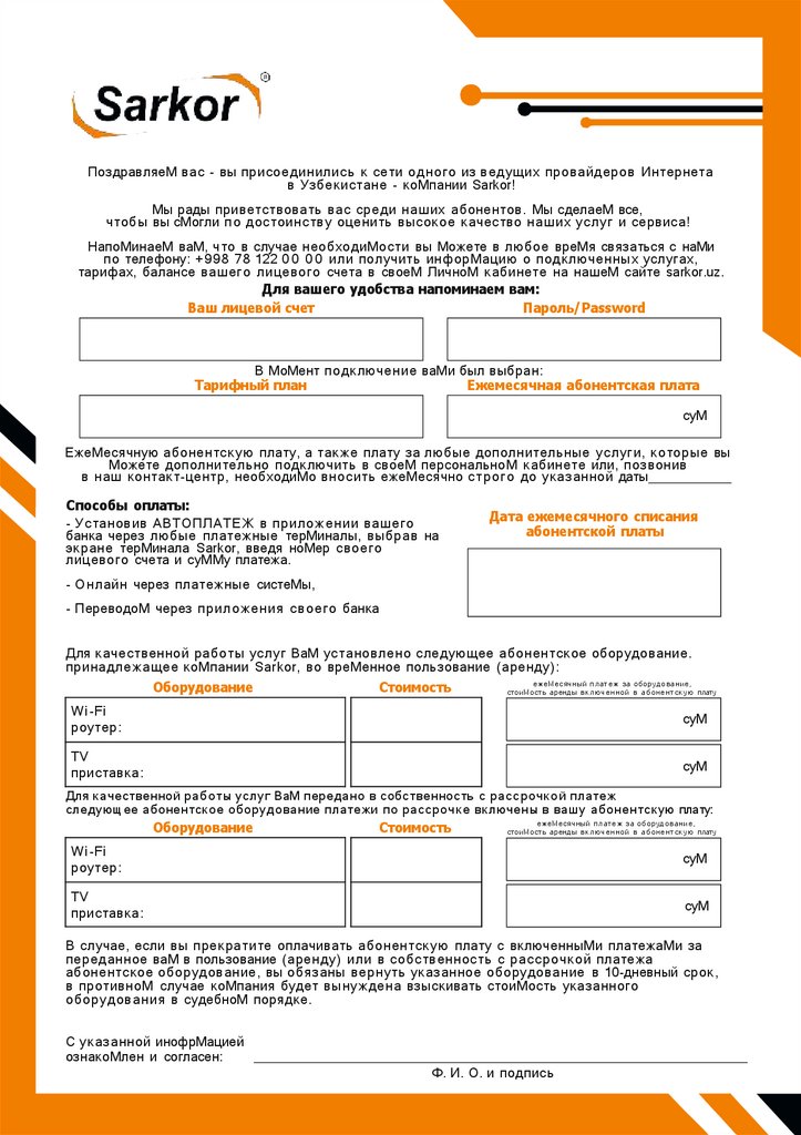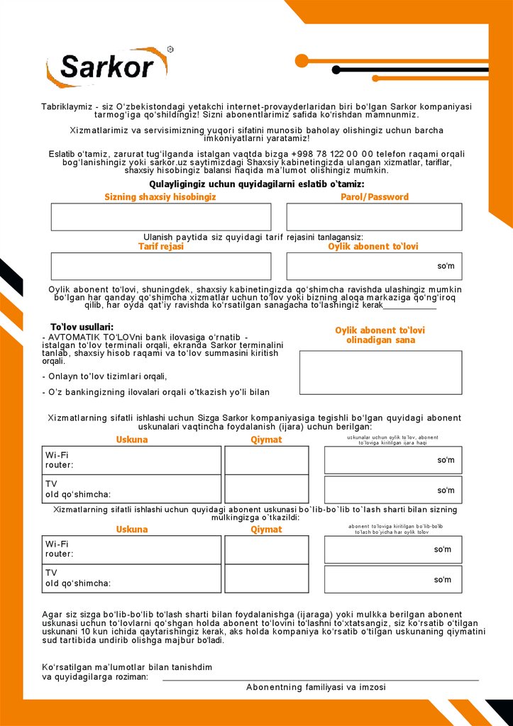 Tabriklaymiz - siz O‘zbekistondagi yetakchi internet-provayderlaridan biri bo‘lgan Sarkor kompaniyasitarmog‘iga qo‘shildingiz! Sizni abonentlarimiz safida ko‘rishdan mamnunmiz.