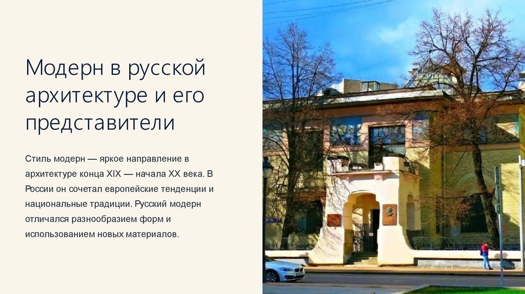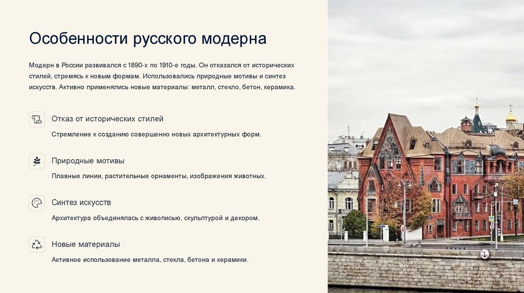 Особенности русского модернаМодерн в России развивался с 1890-х по 1910-е годы. Он отказался от исторических