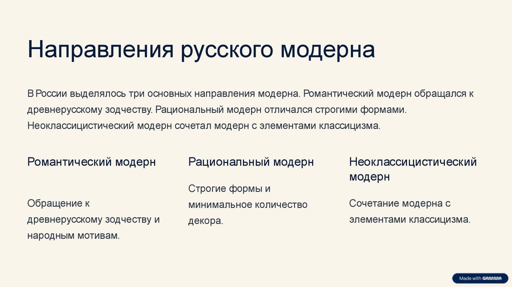 Направления русского модернаВ России выделялось три основных направления модерна. Романтический модерн обращался к
