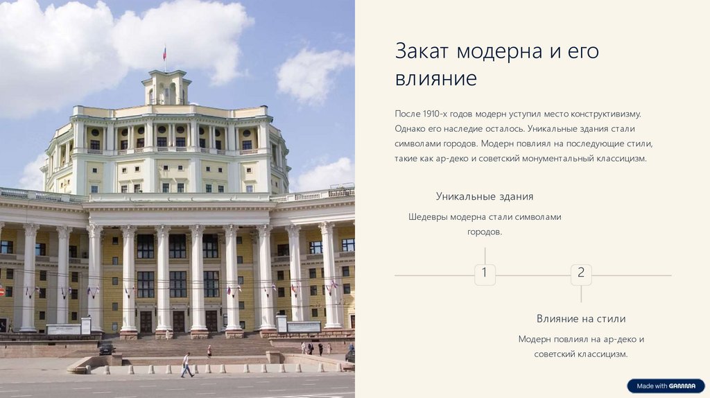 Неоклассицистический модерн сочетал модерн с элементами классицизма.