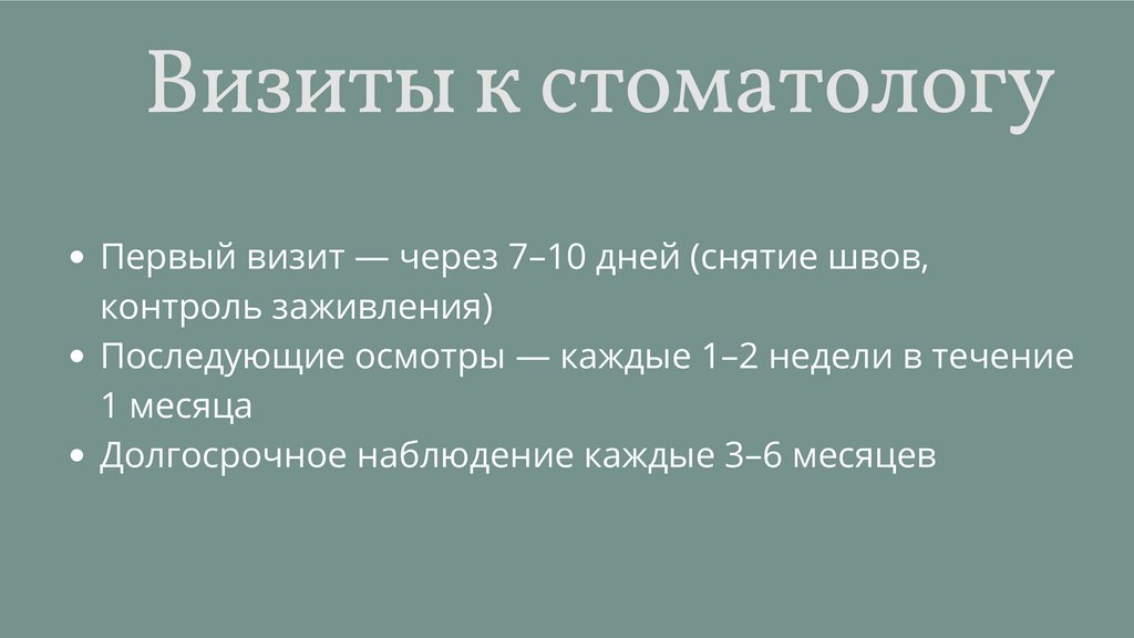 Визиты к стоматологуПервый визит — через 7–10 дней (снятие швов,