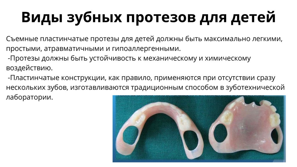 Виды зубных протезов для детейСъемные пластинчатые протезы для детей должны быть максимально легкими,
