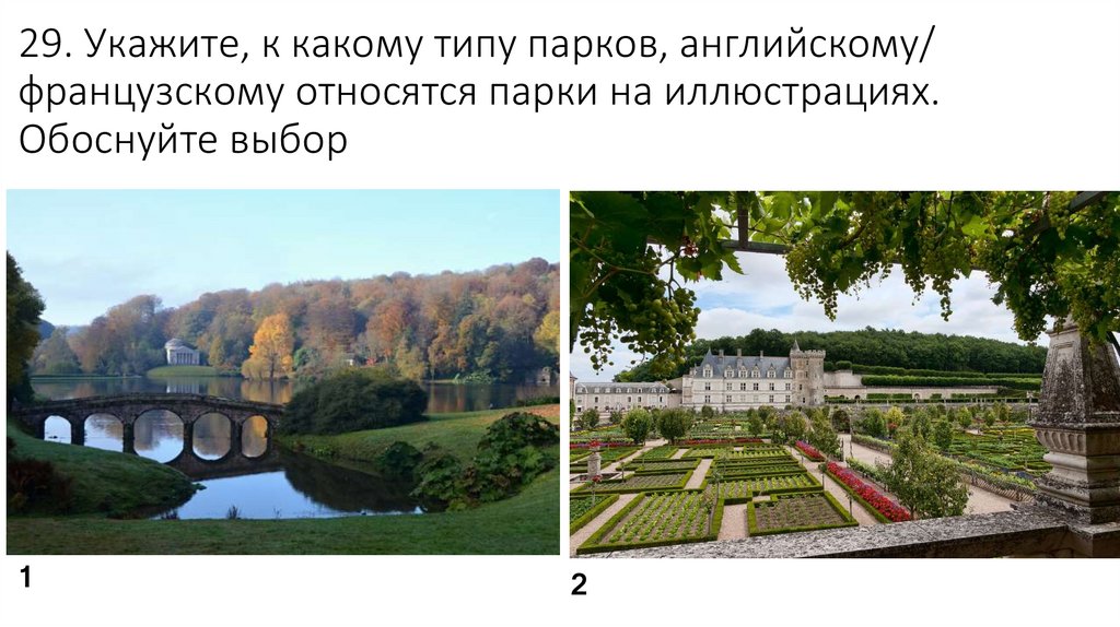 32. 29. Укажите, к какому типу парков, английскому/ французскому относятся парки на иллюстрациях. Обоснуйте выбор