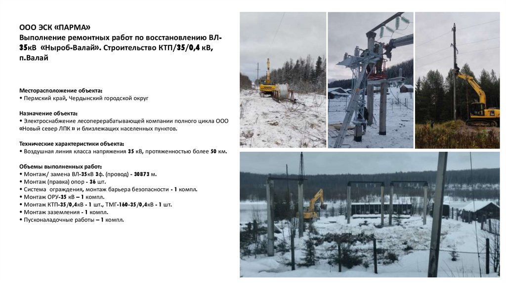 ООО ЭСК «ПАРМА»Выполнение ремонтных работ по восстановлению ВЛ35кВ «Ныроб-Валай». Строительство КТП/35/0,4 кВ,