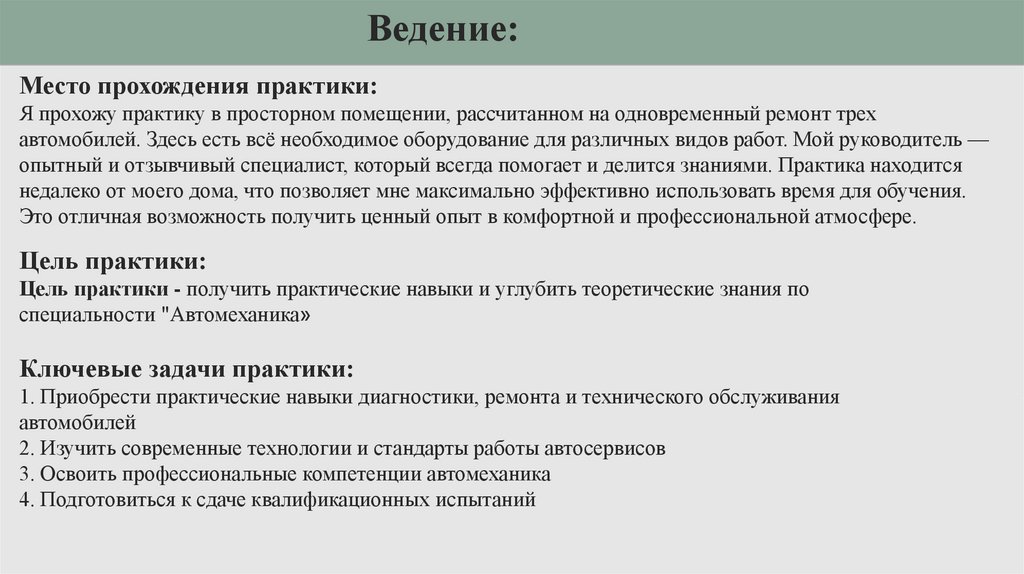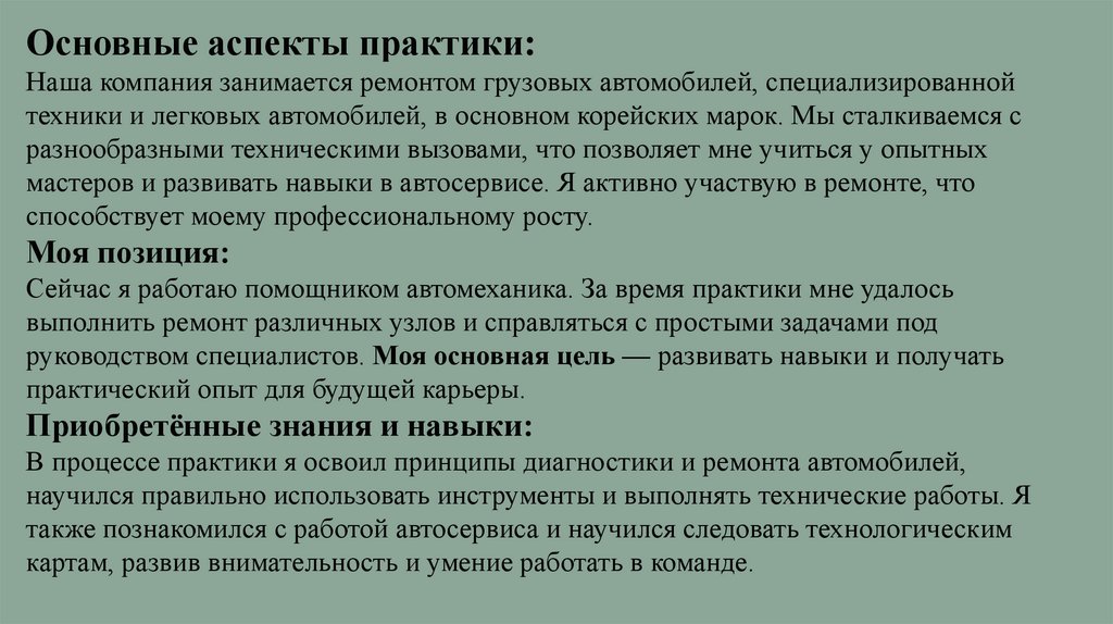 В процессе практики я освоил принципы диагностики и ремонта автомобилей,