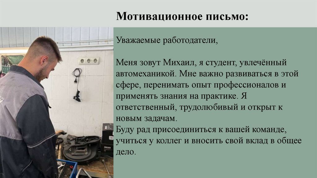 Сейчас я работаю помощником автомеханика. За время практики мне удалось