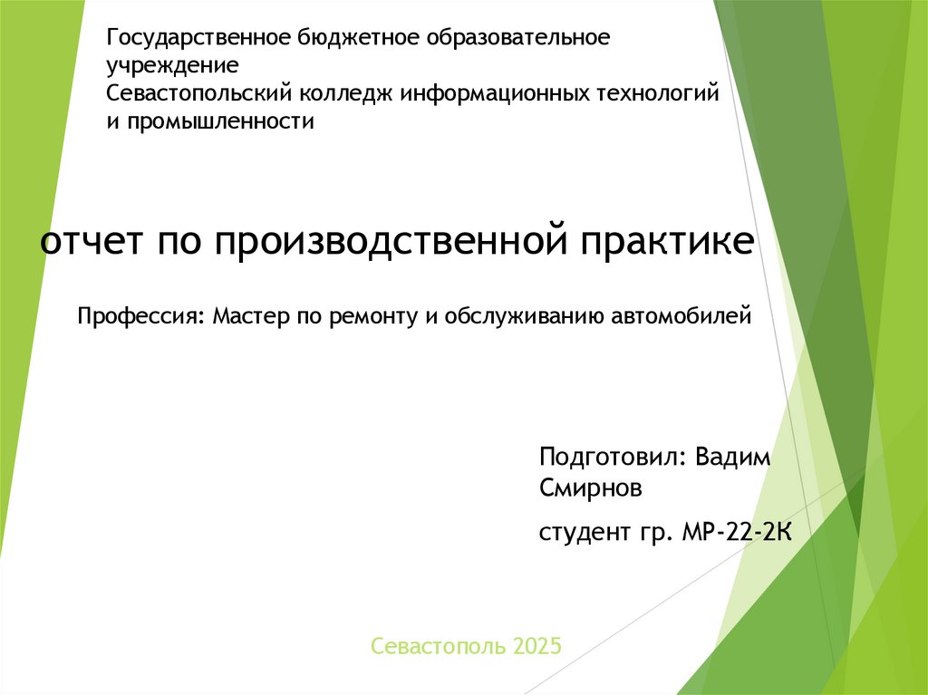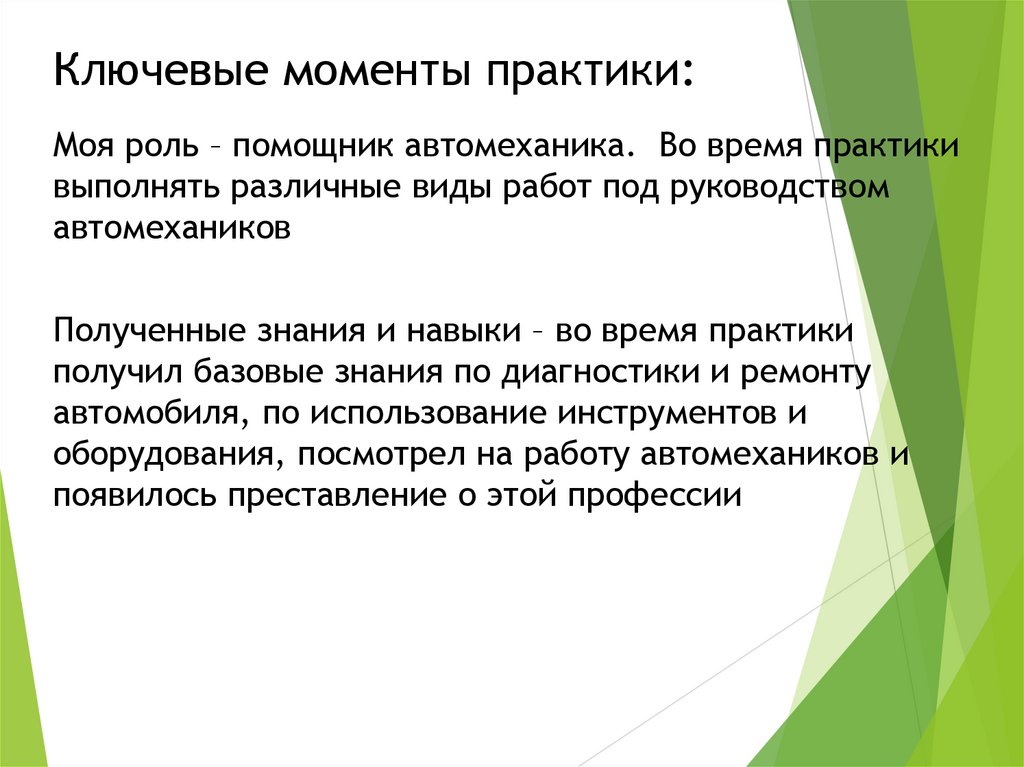 Ключевые моменты практики:Моя роль – помощник автомеханика. Во время практики