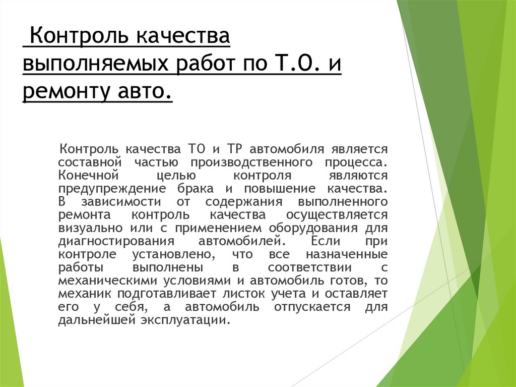 12. Контроль качества выполняемых работ по Т.О. и ремонту авто.