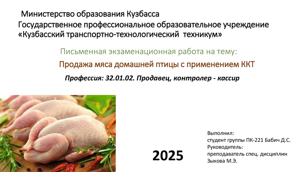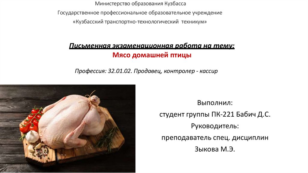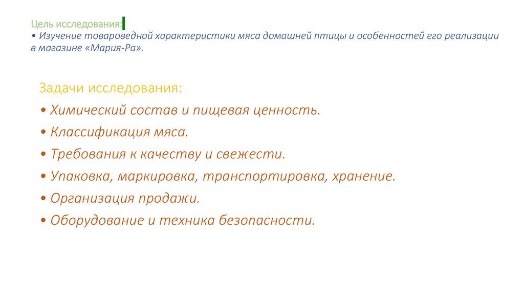 Цель исследования:• Изучение товароведной характеристики мяса домашней птицы и особенностей его реализации