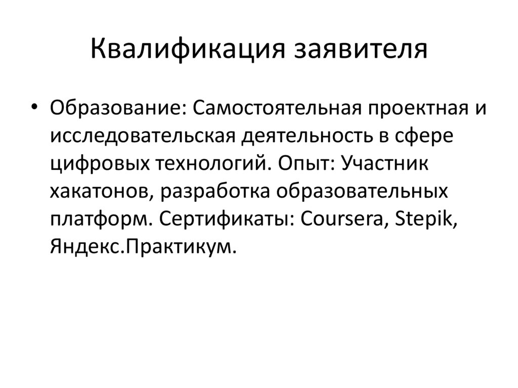 Квалификация заявителя• Образование: Самостоятельная проектная и