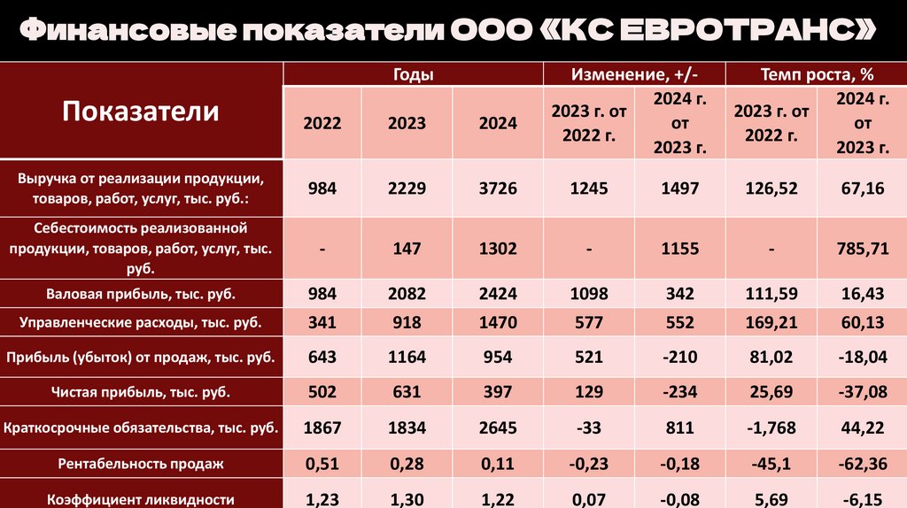 Финансовые показатели ООО «КС ЕВРОТРАНС»Годы