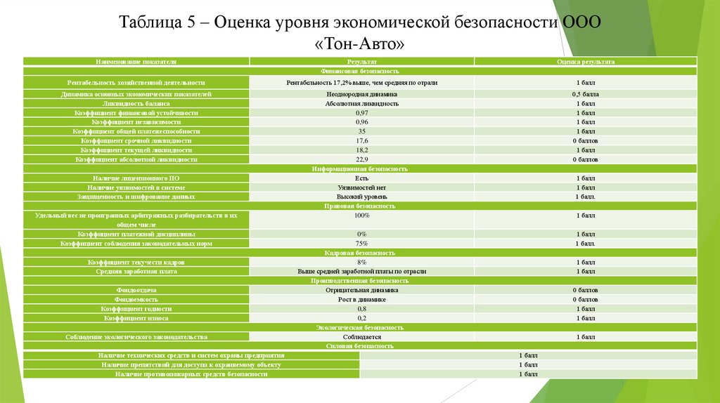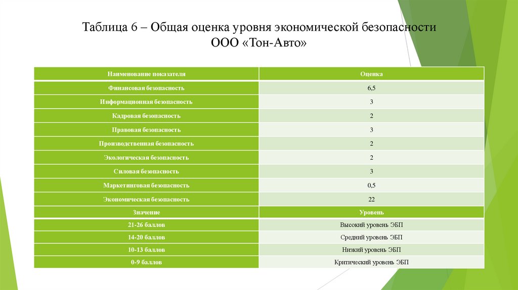 6. Таблица 6 – Общая оценка уровня экономической безопасности ООО «Тон-Авто»