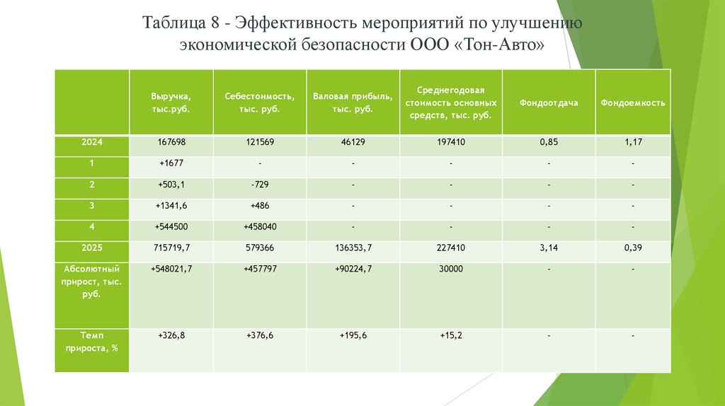 8. Таблица 8 - Эффективность мероприятий по улучшению экономической безопасности ООО «Тон-Авто»