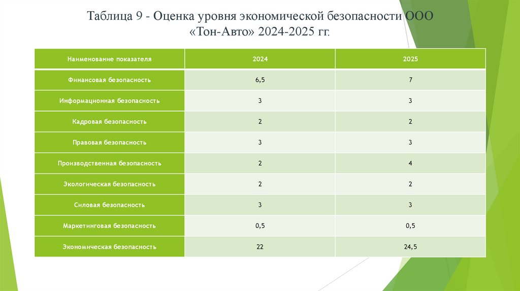 9. Таблица 9 - Оценка уровня экономической безопасности ООО «Тон-Авто» 2024-2025 гг.