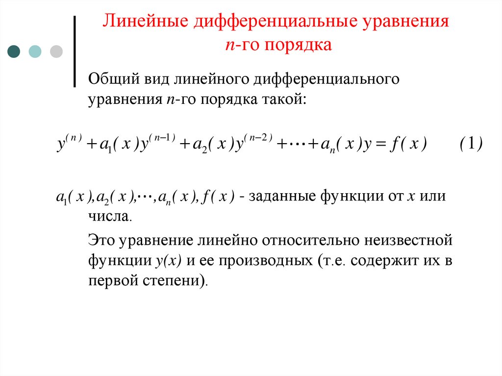 Общий вид линейного дифференциальногоуравнения n-го порядка такой: