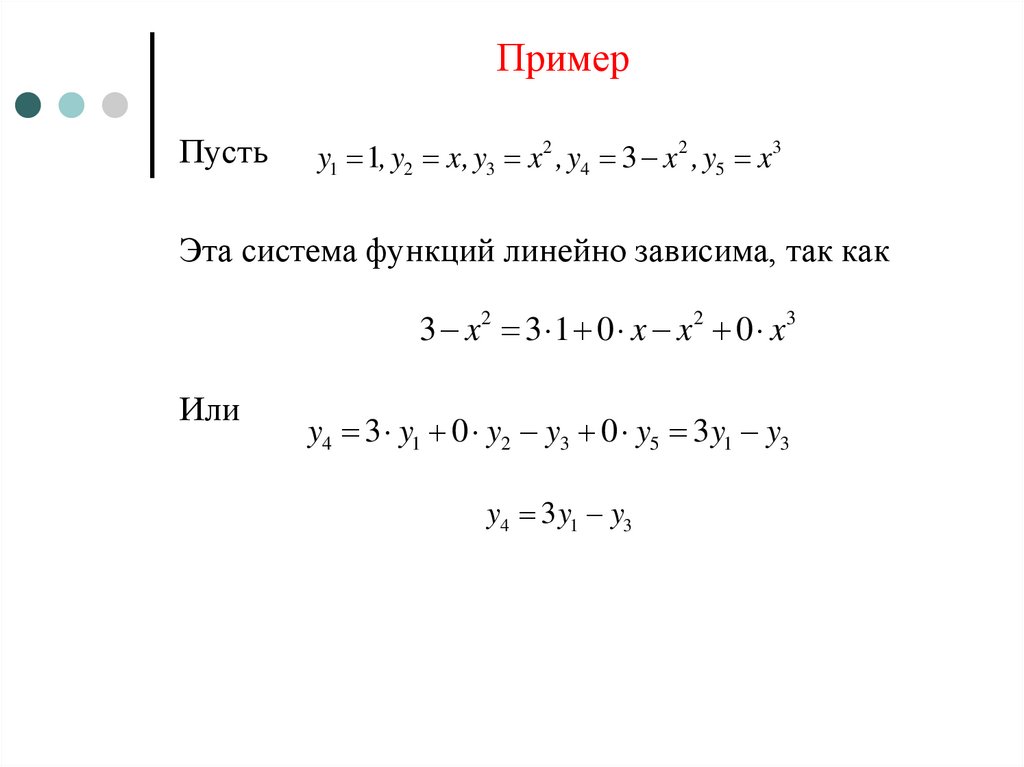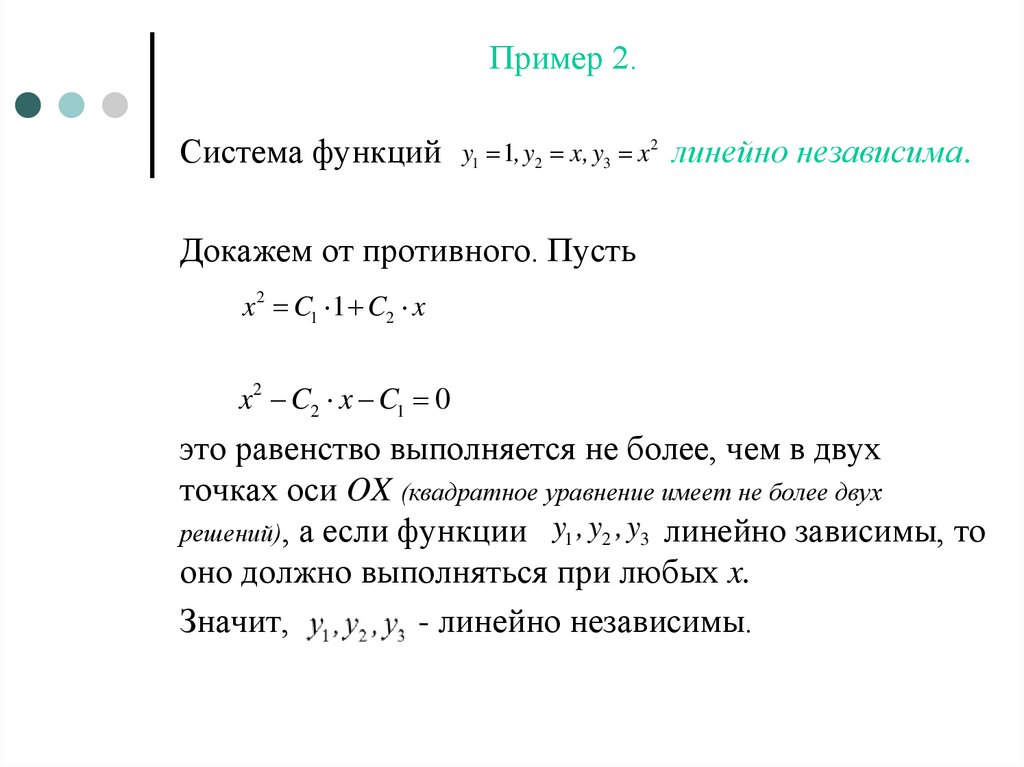 Система функций y1 1, y2 x, y3 x2 линейно независима.Докажем от противного. Пусть