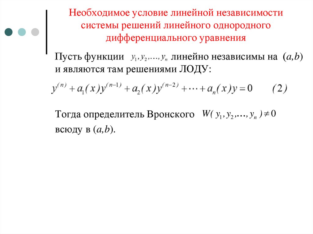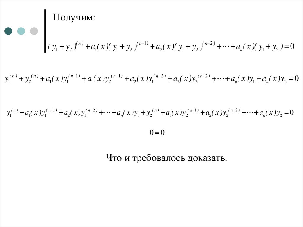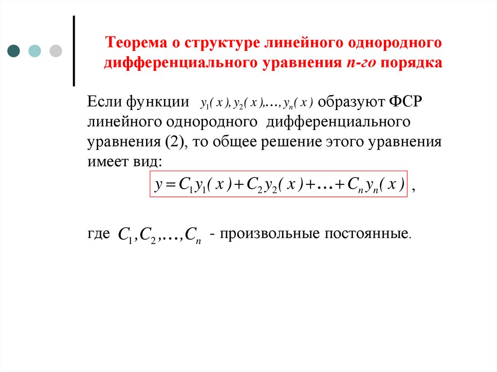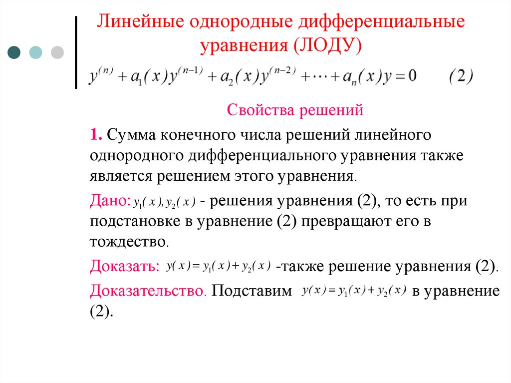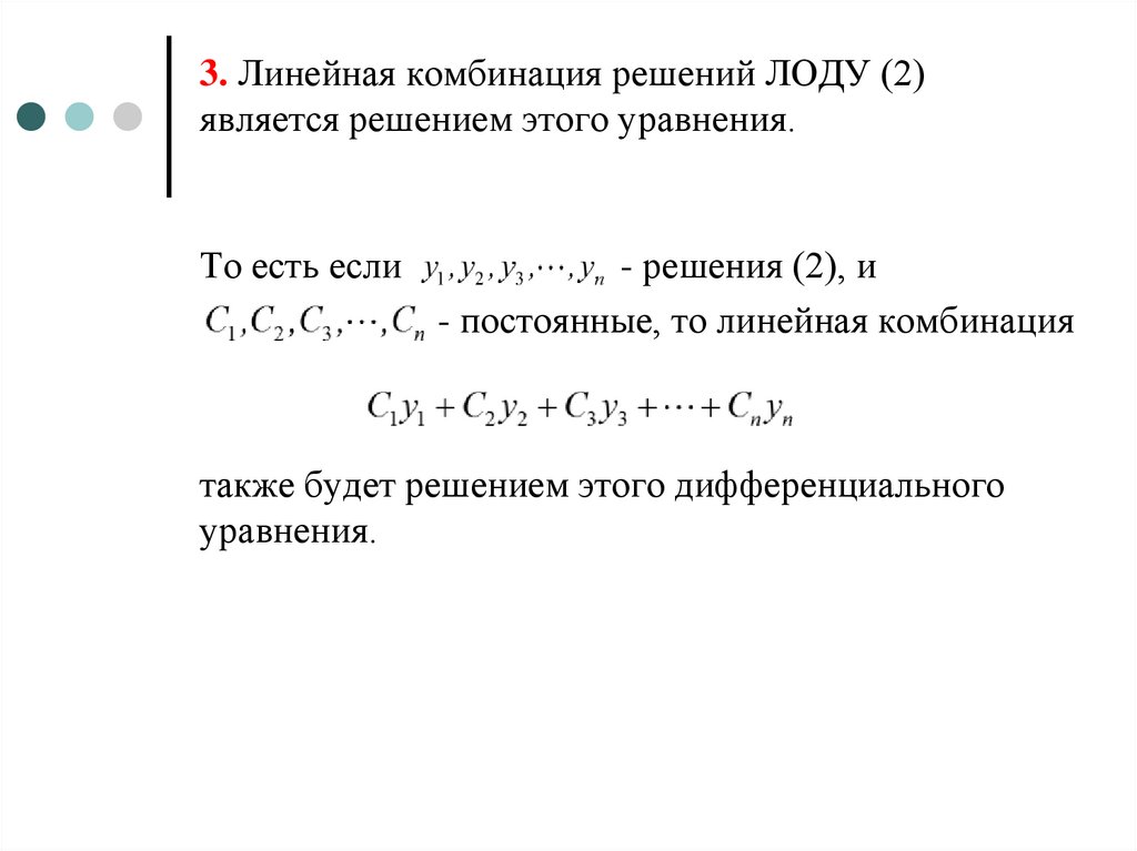 10. 3. Линейная комбинация решений ЛОДУ (2) является решением этого уравнения.