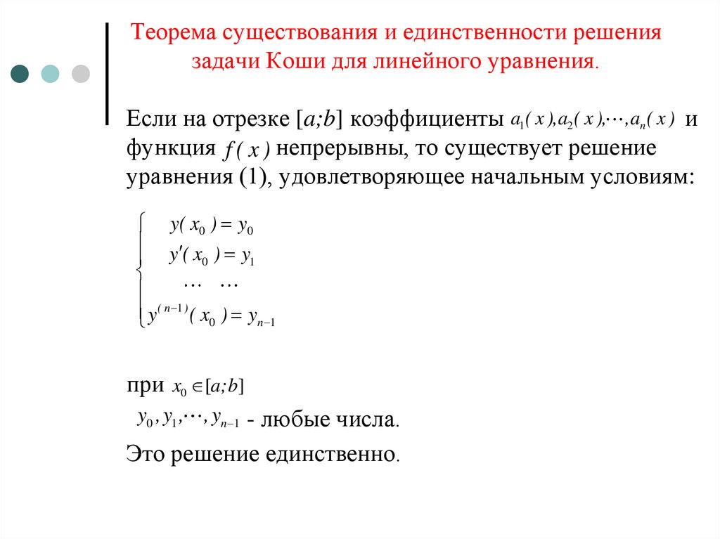 Если на отрезке [a;b] коэффициенты a1( x ),a2 ( x ), ,an ( x ) ифункция f ( x ) непрерывны, то существует решение