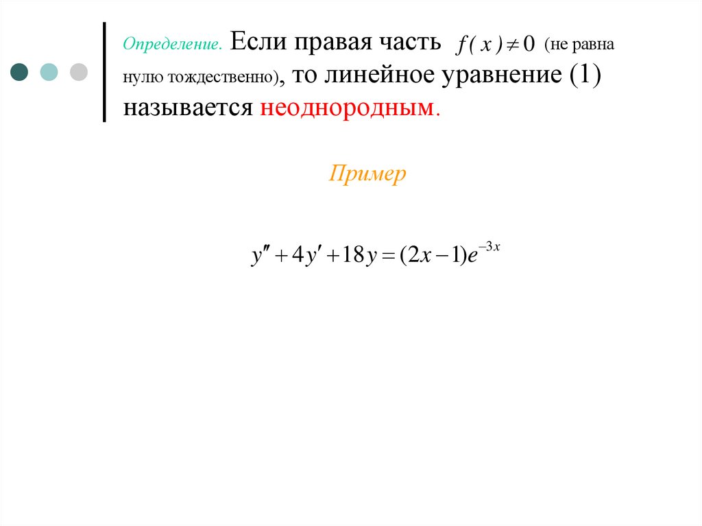 5. Определение. Если правая часть (не равна нулю тождественно), то линейное уравнение (1) называется неоднородным.