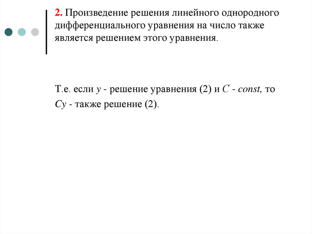 8. 2. Произведение решения линейного однородного дифференциального уравнения на число также является решением этого уравнения.