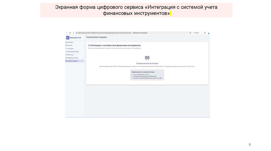 Экранная форма цифрового сервиса «Интеграция с системой учетафинансовых инструментов»