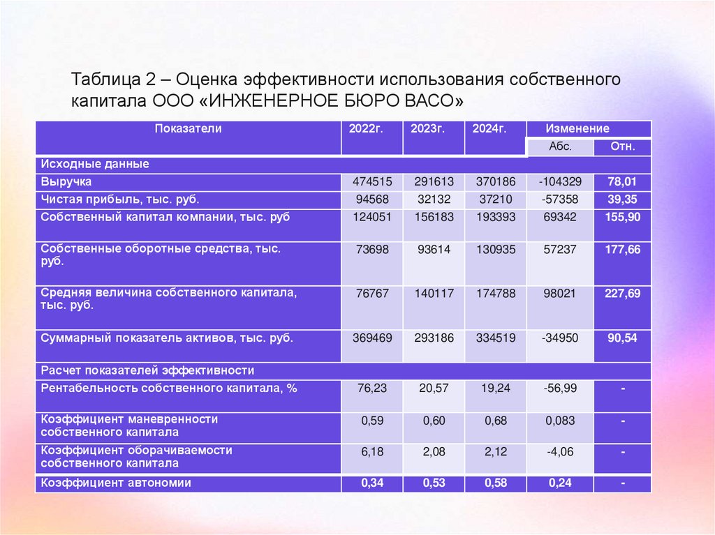 Таблица 2 – Оценка эффективности использования собственногокапитала ООО «ИНЖЕНЕРНОЕ БЮРО ВАСО»