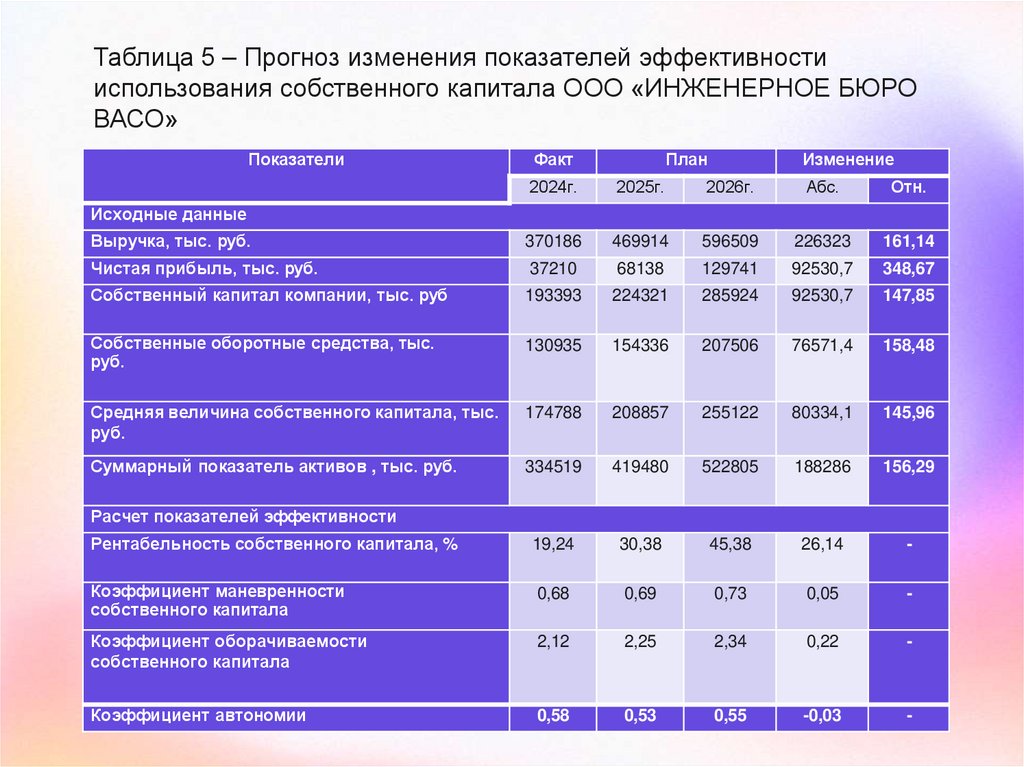 Таблица 5 – Прогноз изменения показателей эффективностииспользования собственного капитала ООО «ИНЖЕНЕРНОЕ БЮРО