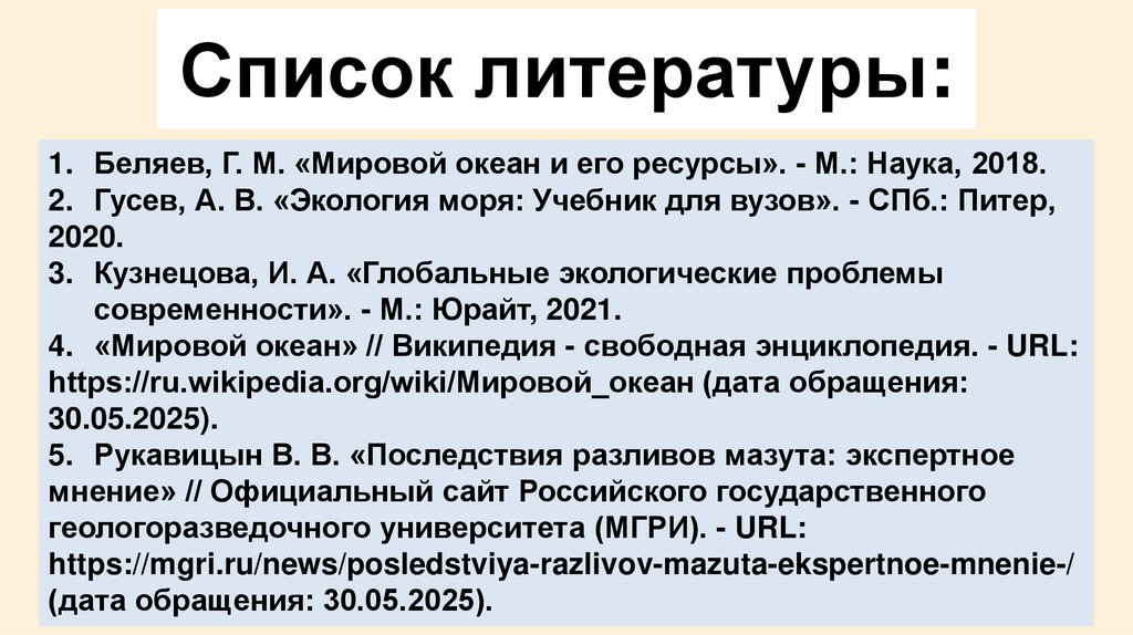 1. Беляев, Г. М. «Мировой океан и его ресурсы». - М.: Наука, 2018.2. Гусев, А. В. «Экология моря: Учебник для вузов». - СПб.: Питер,