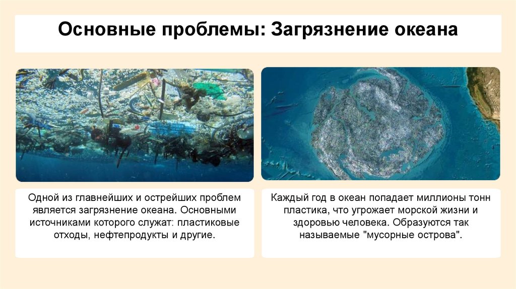 Основные проблемы: Загрязнение океанаОдной из главнейших и острейших проблем