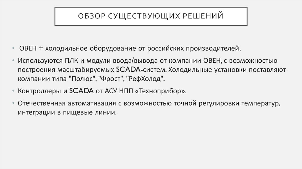 ОБЗОР СУЩЕСТВУЮЩИХ РЕШЕНИЙ• ОВЕН + холодильное оборудование от российских производителей.