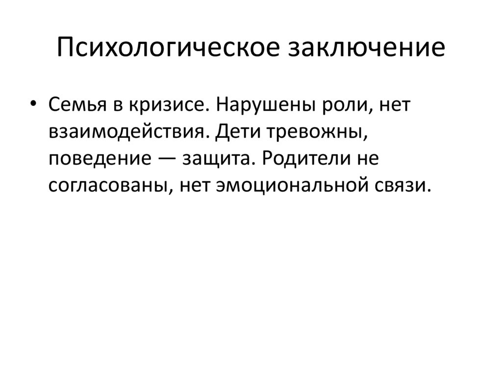 Психологическое заключение• Семья в кризисе. Нарушены роли, нет