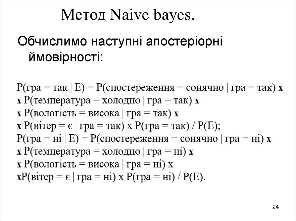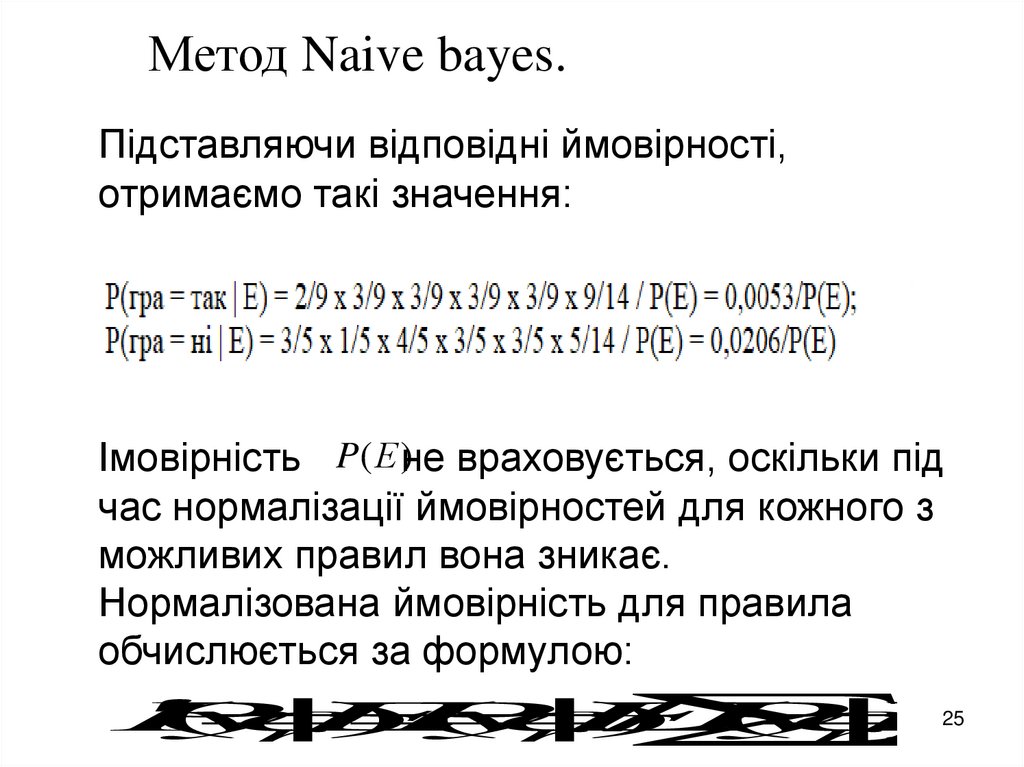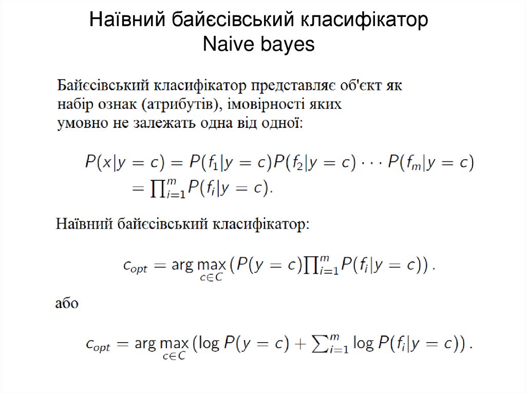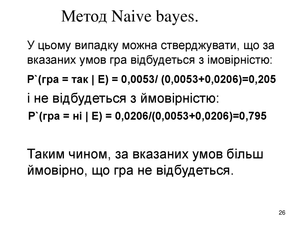 Метод Naive bayes.Підставляючи відповідні ймовірності,