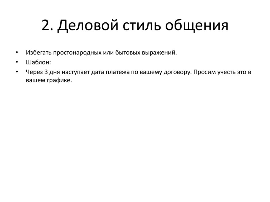 2. Деловой стиль общенияИзбегать простонародных или бытовых выражений.