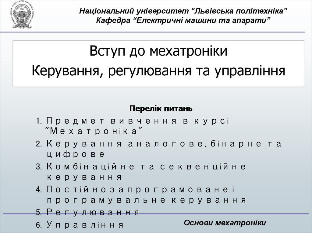 1. Вступ до мехатроніки Керування, регулювання та управління