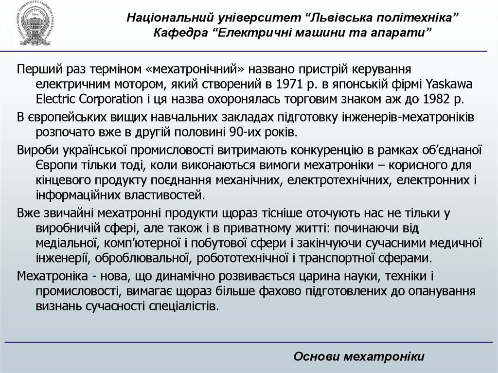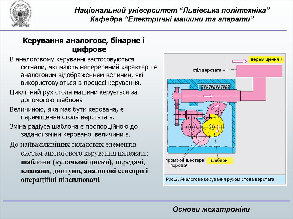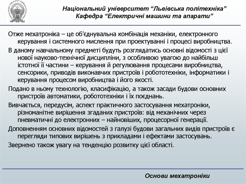 Вивчається, передусім, аспект практичного застосування мехатроніки,