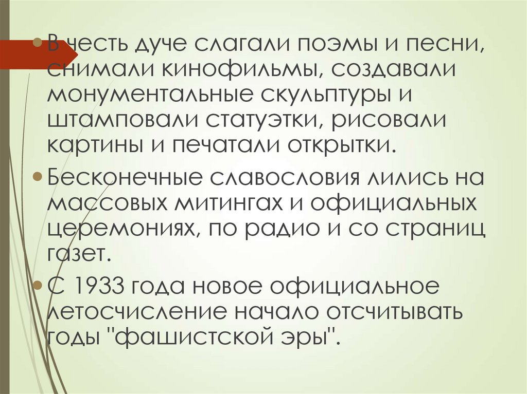 В честь дуче слагали поэмы и песни,снимали кинофильмы, создавали
